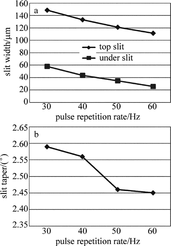 激光能量是切割過程得以進行的主要能量來源,功率大小將直接影響切割時的能量密度。圖 6為采用脈沖頻率50Hz、切割速率30mm/min、激光功率分別為16W, 20W, 24W, 28W時,切縫寬度與錐度隨功率的變化情況。由實驗可知,激光功率對切縫寬度和錐度有重要影響,隨著功率的增大,切縫寬度增大錐度減小,材料去除量增加。