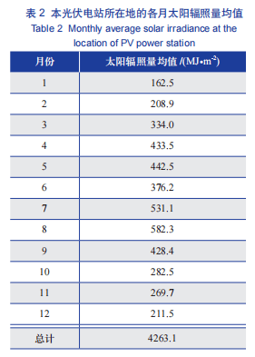 根據(jù)本光伏電站所在地多年內(nèi)各月太陽輻照量數(shù)據(jù),求平均值后可得到各月太陽輻照量均值, 具體如表 2 所示。